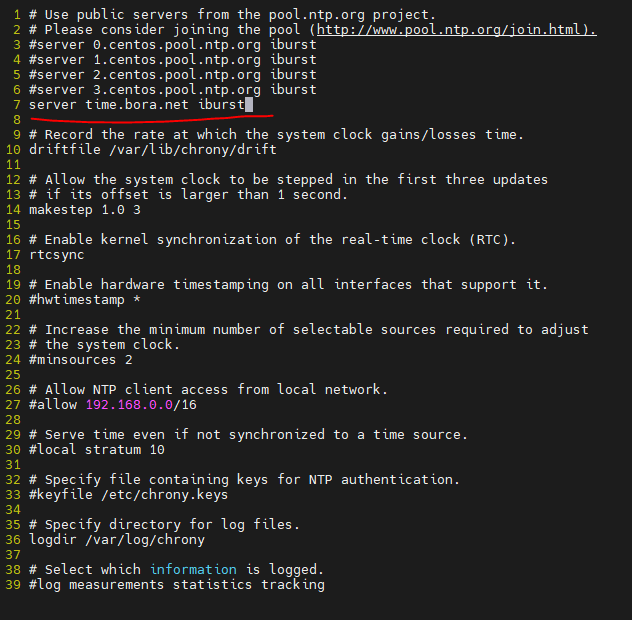 3. 7행과 같이 server <NTP 주소> iburst 입력
