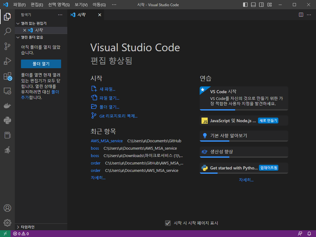 - 아래와 같이 VSCode 창이 뜨면 정상적으로 설치가 되었습니다.