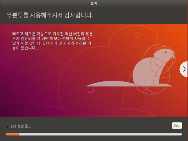 9. 지금부터 우분투를 설치 진행 과정을 볼 수 있으며, 설치가 끝날 때까지 기다린다.