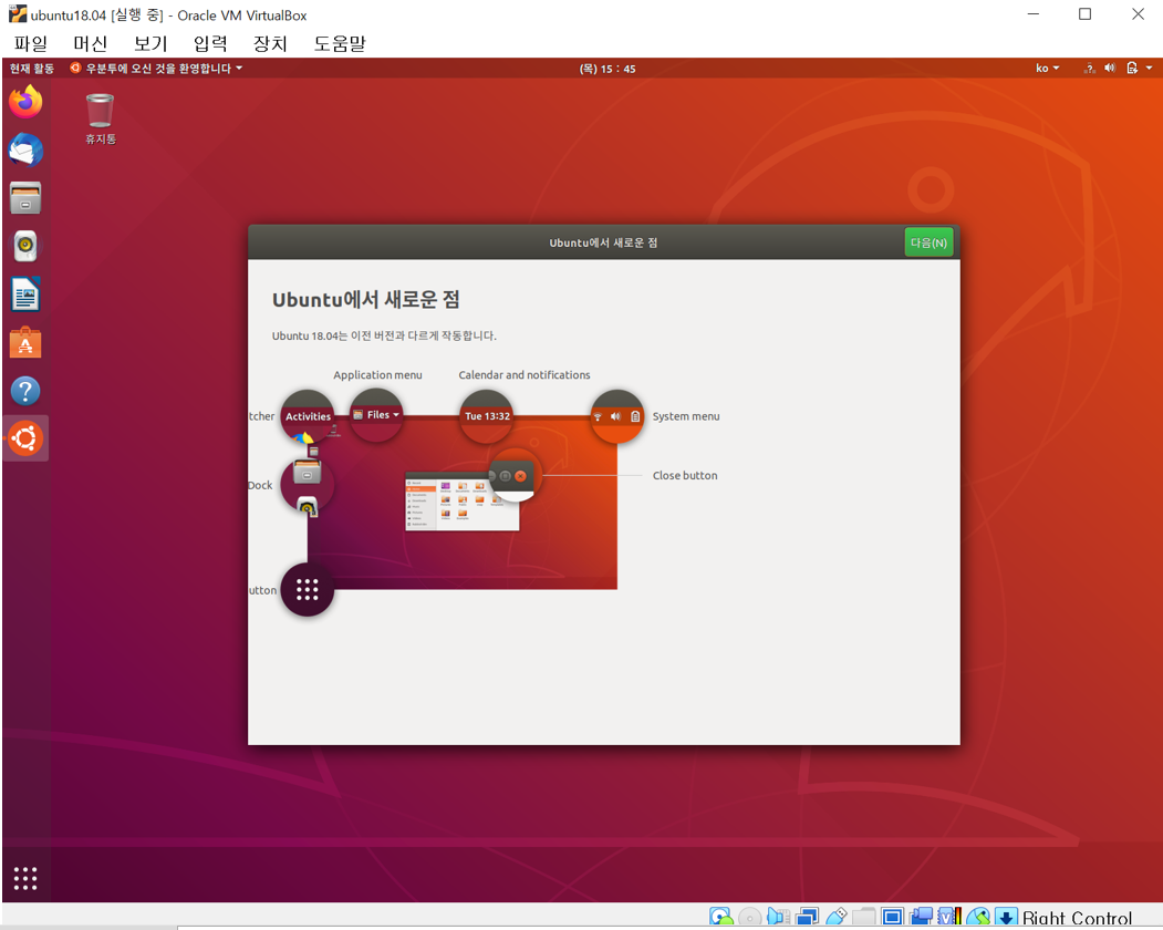 11. 우분투 바탕화면이 뜬다. 성공적으로 설치가 완료되었다.!!