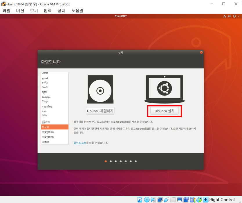 2. 한국어 언어를 선택하고 Ubuntu 설치 버튼을 클릭한다.