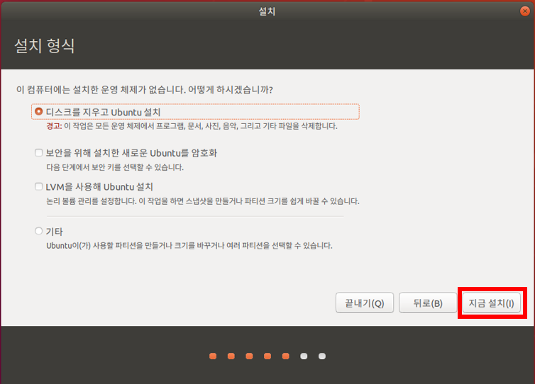 5. 설치 형식 창에서 "디스크를 지우고 Ubuntu 설치" 클릭하고 지금 설치 버튼을 클릭한다.