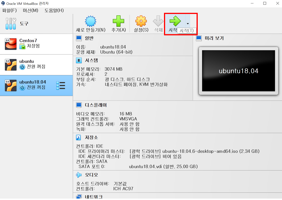 1. ubuntu18.04 가상머신에서 시작 버튼을 클릭한다.