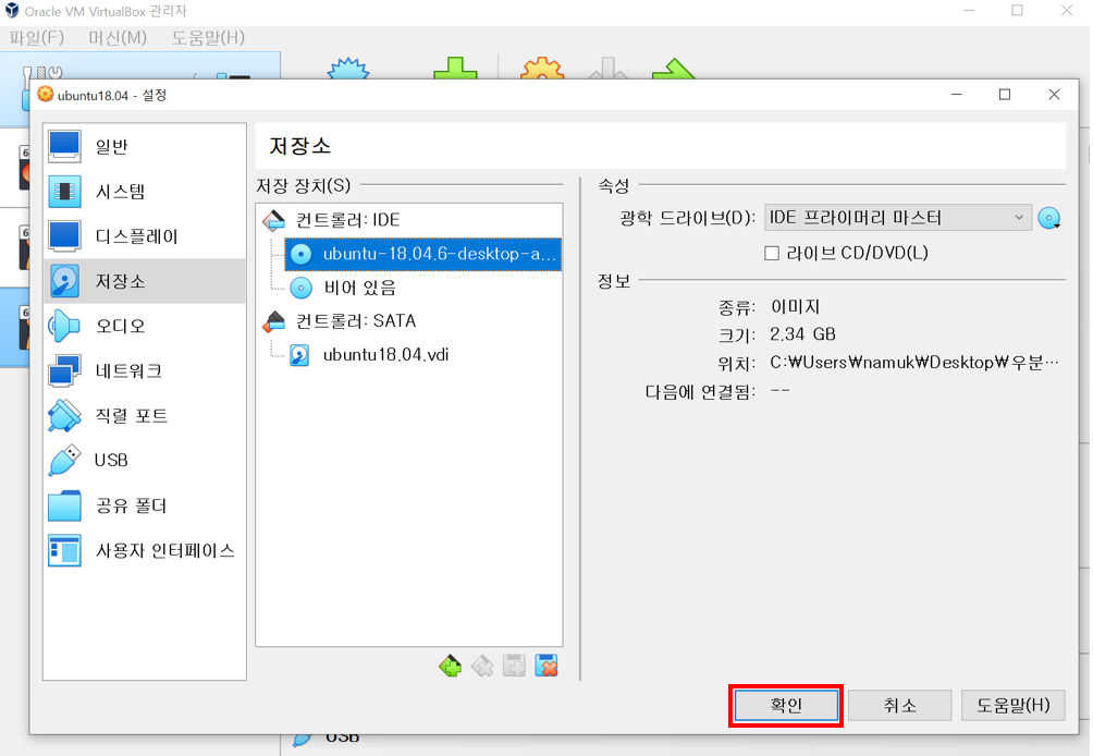 6. 저장소의 속성->광학 드라이브(D)를 보면 iso 파일이 추가된 것을 확인하고, 확인 버튼을 클릭한다.