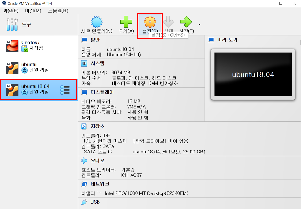 "ubuntu18.04 가상머신을 생성했으니, ubuntu18.04 가상머신에 대해 설정한다."