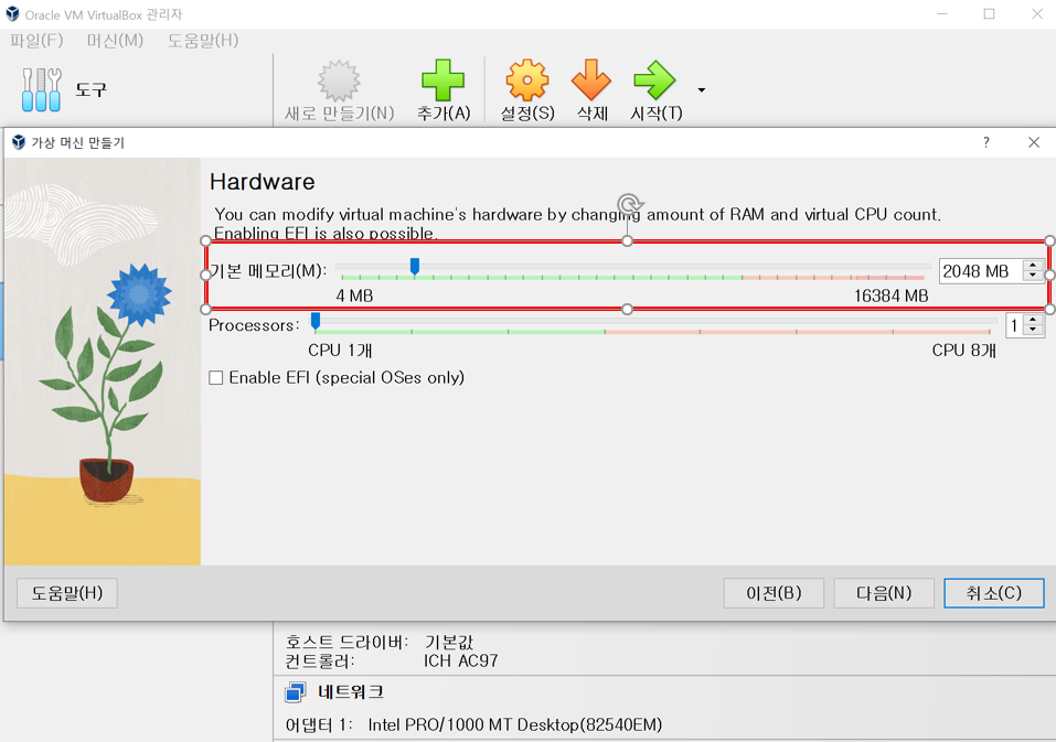 3. CPU 및 메모리 크기를 정할 수 있습니다. 현재 메모리에서 VM에 가용할 메모리를 지정하여 사용할 수 있다.
