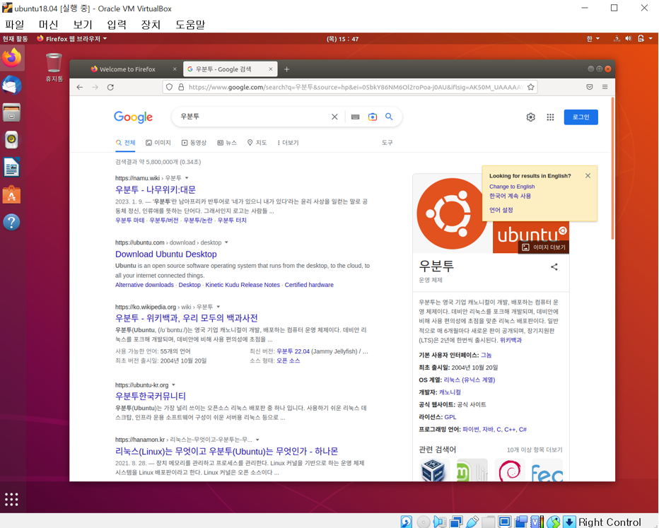 VM의 우분투 창을 크기 조정할 수 있다.
