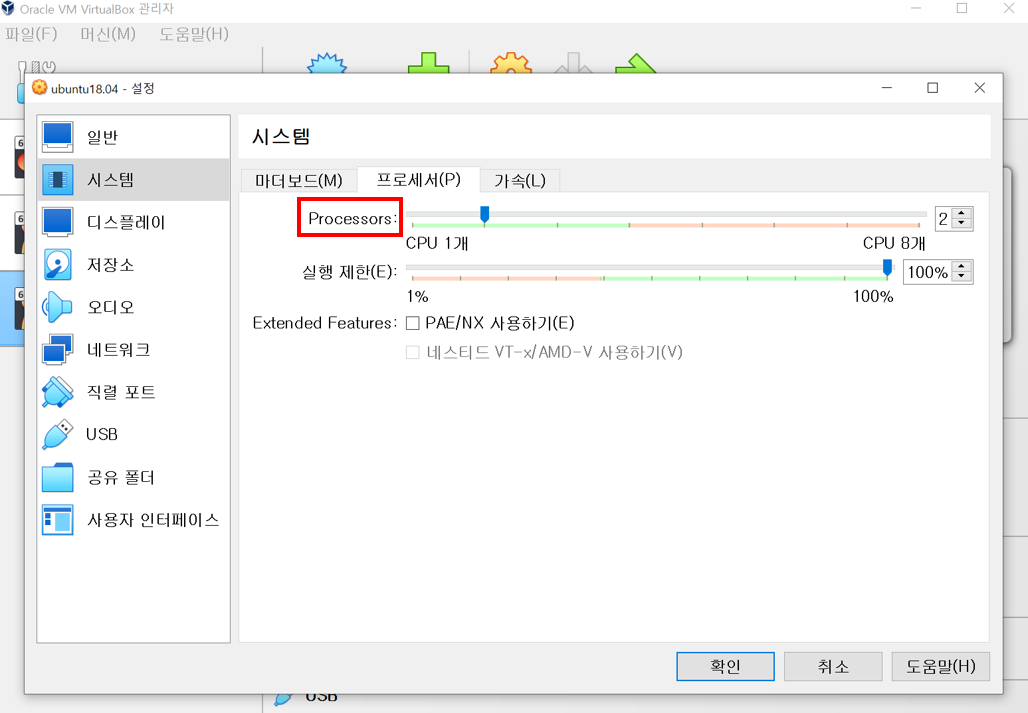 2. 시스템의 프로세서에서 프로세서 개수를 설정할 수 있는데, 쓰레드와 프로세싱까지 생각하여 설정해둔다.