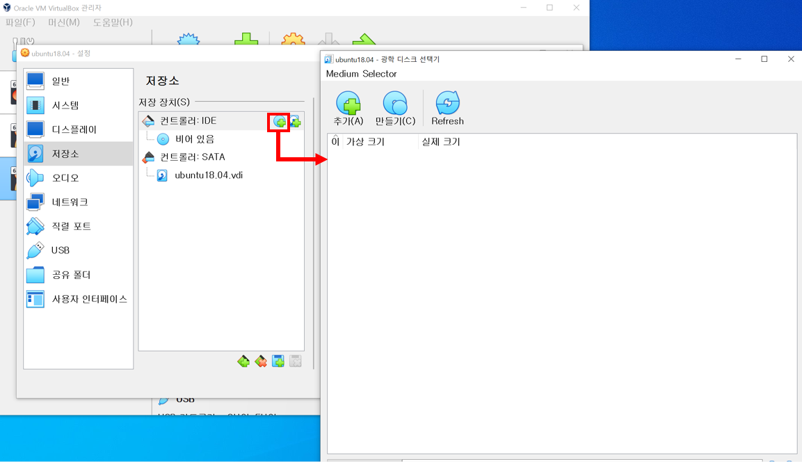 추가 버튼을 클릭하고, ubuntu-18.04.6-desktop-amd64 iso 파일을 찾아서 선택하고 클릭한다.