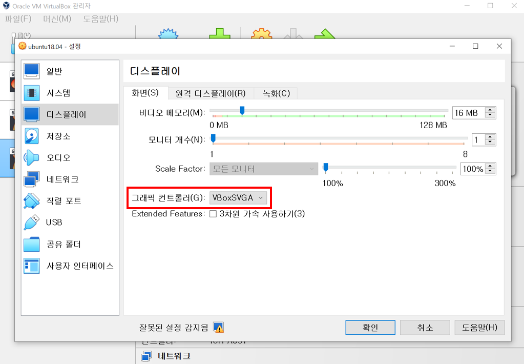 3. VM(가상머신)의 디스플레이에서 그래픽 컨트롤러(G): VBoxSVGA으로 설정하면,