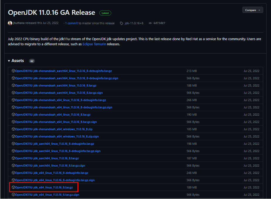 wget https://github.com/AdoptOpenJDK/openjdk11-upstream-binaries/releases/download/jdk-11.0.16%2B8/OpenJDK11U-jdk_x64_linux_11.0.16_8.tar.gz