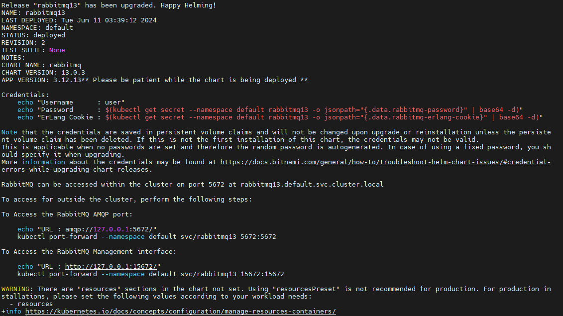 helm upgrade --install rabbitmq --version 13.0.3 --set auth.username=user --set auth.password=PASSWORD --set metrics.enabled=true bitnami/rabbitmq