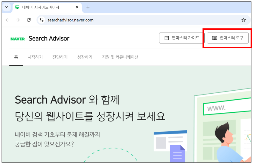 2.네이버 서치어드바이저 사이트에서 "웹마스터 도구" 클릭
